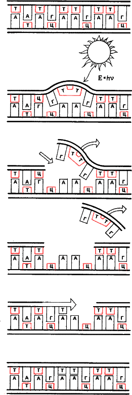 Disebut sebagai perbaikan gelap atau dark repair, karena tidak membutuhkan cahaya. Proses perbaikan ini memperbaiki dimer pirimidin yang terbentuk akibat induksi cahaya UV.